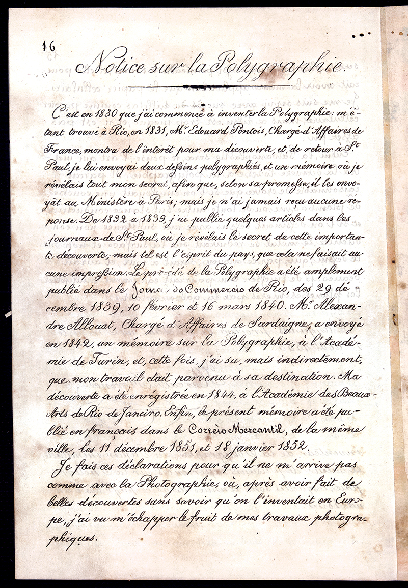 Ao que acaba de ler-se acerca dos trabalhos de Breyer em Liège, devemos acrescentar o artigo seguinte que, debaixo do título de ‘Descoberta da Polygraphia’, se lê na Phenix de São Paulo de 26 de outubro, onde aparece assinado por Hercules Florence, genro do nobre deputado o senhor Álvares Machado. Comparem os leitores as datas e decidam se o mundo deve a descoberta da photographia, ou pelo menos da polygraphia, à Europa ou ao Brasil.44