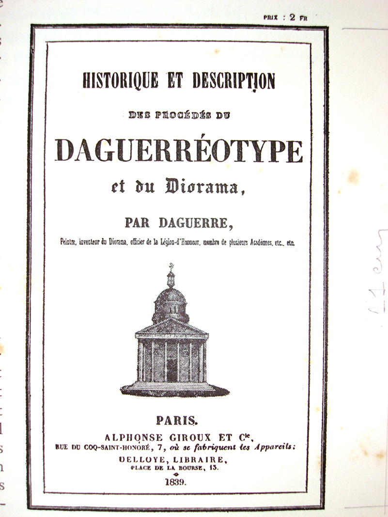 DAGUERRE, Louis Jacques Mandé. Historique et description des procédés du daguerreotype et du diorama par Daguerre, peintre, inventeur du Diorama, officier de la Légion d’Honneur, membre de plusieurs Académies, etc., etc. Paris: Susse frères, éditeurs, place de la Bourse, 31; Delloye, libraire, place de la Bourse, 13, 1839.