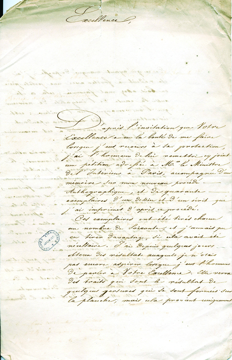J’ai l’honneur d’adresser ci joint à V. E. une lettre de M. H. Florence pour M. le Ministre de l’Intérieur, ainsi qu’un mémoire relatif à un nouveau procédé Authographique dont il est inventeur, et 40 Exemplaires d’un écrit et d’un dessin imprimés d’après ce procédé.