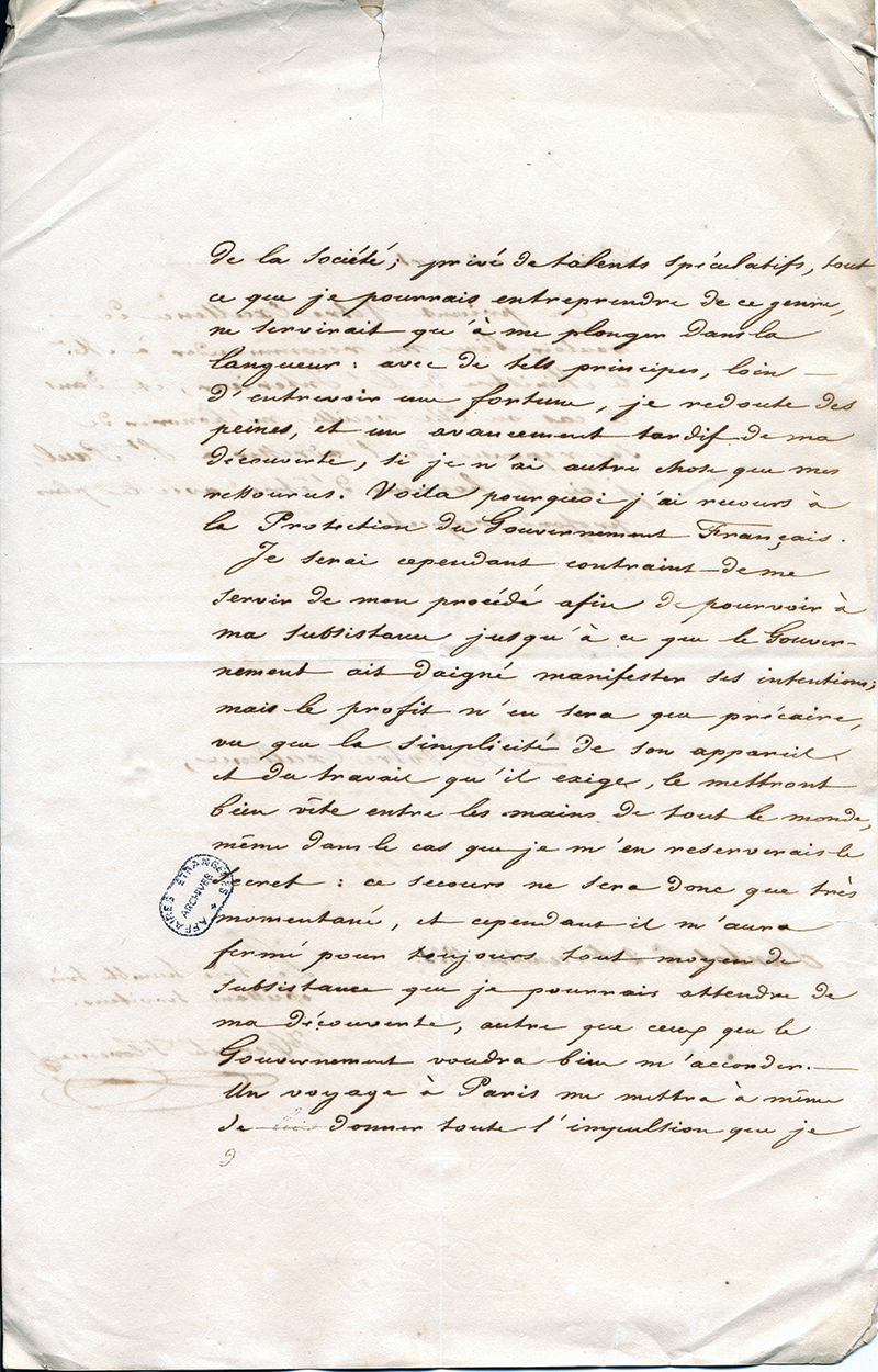 Eu serei, contudo, obrigado a me utilizar de meu procedimento a fim de prover a minha subsistência até que o Governo tenha se dignado a manifestar suas intenções; mas esse ganho não será mais que precário, visto que a simplicidade de seu aparelho e do trabalho que ele exige o colocarão rapidamente nas mãos de todo mundo, mesmo no caso de eu conservar o segredo: esse auxílio será bastante momentâneo, e no entanto ele me terá fechado para sempre todo meio de subsistência que eu possa esperar da minha descoberta, além desse que o Governo venha a me conceder. Uma viagem a Paris me permitiria dar toda a impulsão que eu desejo a essa arte.