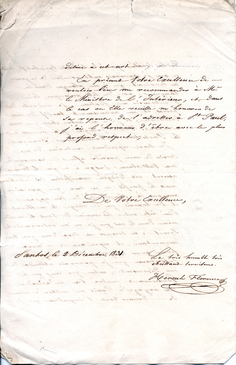 Pelos diversos testemunhos deixados por Florence (cartas, relatos, memórias), também se constata que ele jamais obteve qualquer resposta para a correspondência que enviou ao governo francês a fim de receber uma recompensa pela invenção da poligrafia. Em uma memória que redigiu sobre o mesmo assunto, datada de 1 de agosto de 1853 e enviada ao imperador Pedro II (Figura 4), Florence reiterava a informação já dada em outros testemunhos de que havia revelado todos os segredos de sua descoberta naquela correspondência, diante da promessa do encarregado de negócios da França de enviá-la ao ministério do Interior de seu país. O que não se sabia até agora era se Pontois havia cumprido ou não a promessa…33