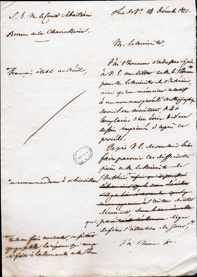 Pontois, como se vê em seu despacho junto à correspondência de Florence, além de remeter a petição do inventor para a chancelaria do Ministère des Affaires étrangères, em Paris, sugere ao ministro da pasta, Horace François Bastien Sébastiani, conde de La Porta (1771-1851), que a encaminhasse com uma recomendação favorável para o ministério do Interior, instância encarregada da concessão de recompensas e privilégios de invenção. Considerando-se que a memória descritiva do procedimento e os papéis impressos pelo inventor não se encontram mais junto às cartas de Florence e Pontois localizadas no CADN, supõe-se que essa documentação tenha seguido seu destino. Só uma pesquisa mais aprofundada sobre a circulação e o armazenamento desses documentos poderá esclarecer se os arquivos de um desses ministérios, afetados por incêndios e pilhagens em ocasiões como a Comuna de Paris e a Segunda Guerra Mundial, ainda conservam a memória e os papéis poligrafados que certamente acompanharam a correspondência aqui reproduzida.