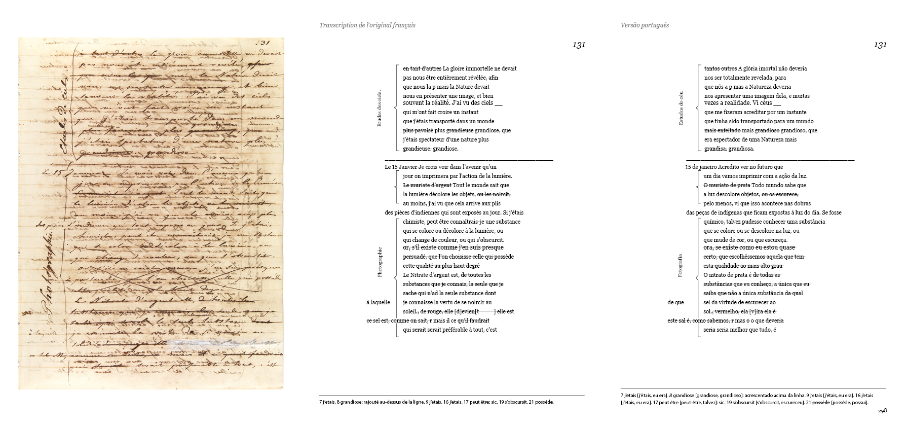 Detalhe da página 131 de Livre d’Annotation et de Premiers Materiaux. Imagem da página à esquerda, transcrição no original francês ao centro, e tradução em português da transcrição à direita.